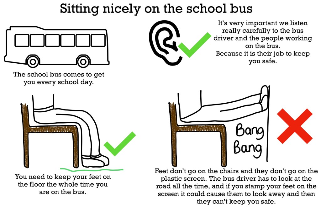 There arn’t even any words in this social story just pictures. And we talked it through before the trip and throughout the trip too. It explains what will happen and what the expectations of behaviour will be.