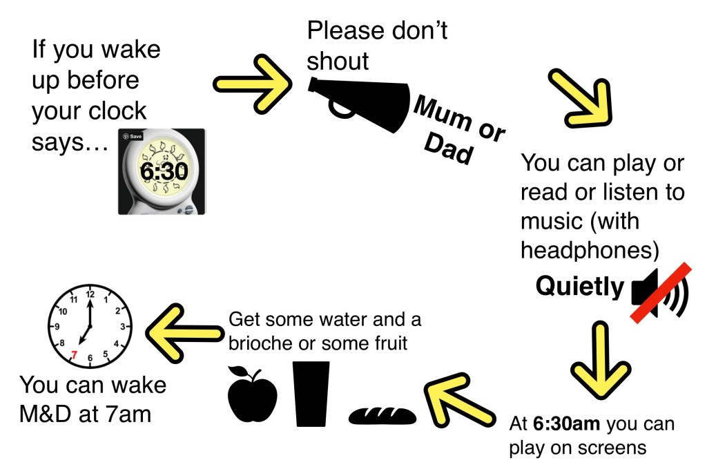 The story above, was something I made as my son kept waking us up before 6.30am (he is a bit older). So I put this up next to his bed and talked it through the night before and he could read it when he woke up in the morning, or if he didn’t follow it we could go through it again with him.