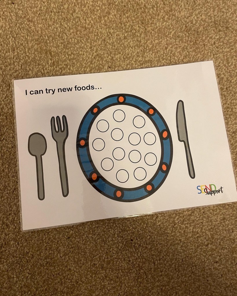 The main way we worked on this was to serve up his normal food and on the table I would keep a reward chart. I would then put something new on a plate to the side of his dinner. Every time he tried a new food he got a sticker. He knew the rules and I would just put the new food on the table, but would not go on about it. We would talk about our day and try and have a normal dinner time, but we wouldn’t mention the new food. But as soon as he tried the new food he would get a sticker. As soon as the reward chart was full he got a reward. We did the chart a few times over and gradually food didn’t seem so scary. I’m not going to lie and say that he now eats everything far from it, but food isn’t so much of a battle and his repertoire has increased.