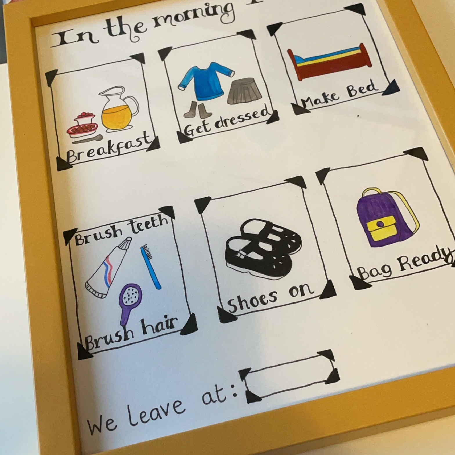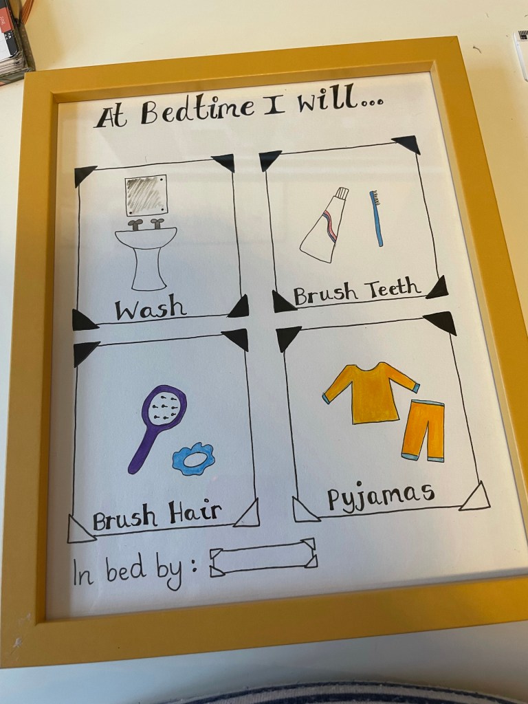 What’s happening this week board – In a previous blog I spoke about how children and Adults with ADHD see time. It’s not linear it’s just a jumbled series of events and how those events make them feel. This is updated weekly so he has quick access to what is happening during the week. He also gets time to process that certain activities that he doesn’t like as much are happening.