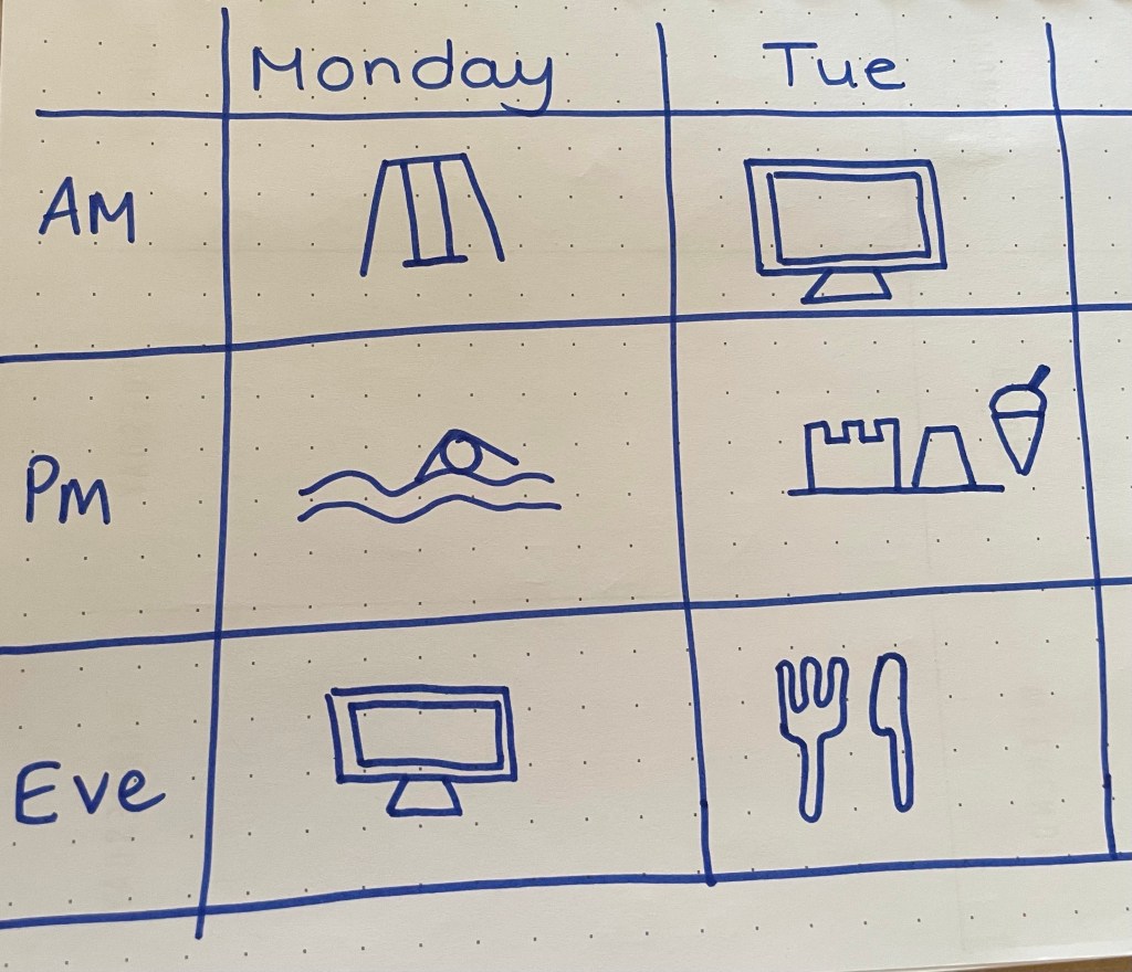Your timetables can be as simple as write out or draw a picture for what is happening in the morning, afternoon and evening or you can go into more detail.