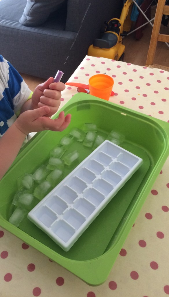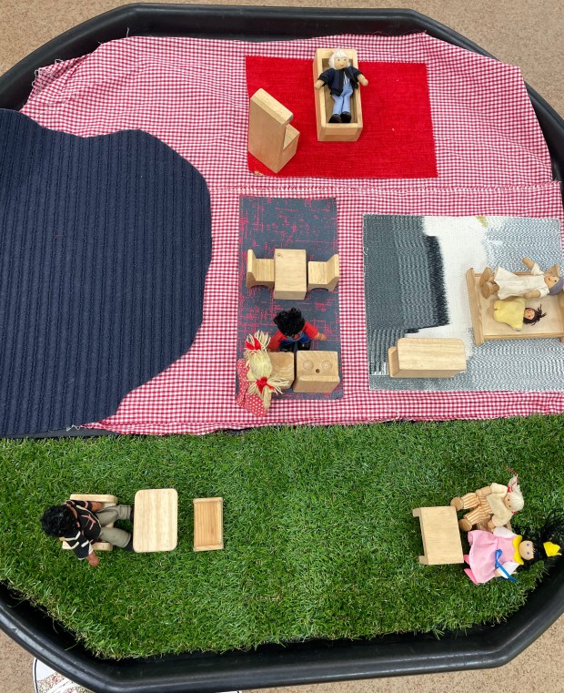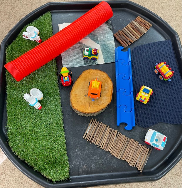 This tray is about cars, but also about the different surfaces they are travelling on – language such as rough, bumpy, smooth can be used. You can think about the car is it going fast or slow. Again so much language can be practiced and introduced with a very simple set up.
